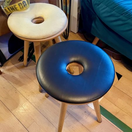 In the Saloon of our barge, we have two gorgeous ring stools. They’re perfect for sitting, putting your feet up, and moving around to other rooms and we use them ALL the time! But we’ve had them for almost ten years at this point, and the fake pleather covers on the tops started flaking off and looked awful. So J prised them apart (the tops were only just glued to the base!), removed the staples, and kept the fabric as a template.