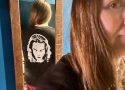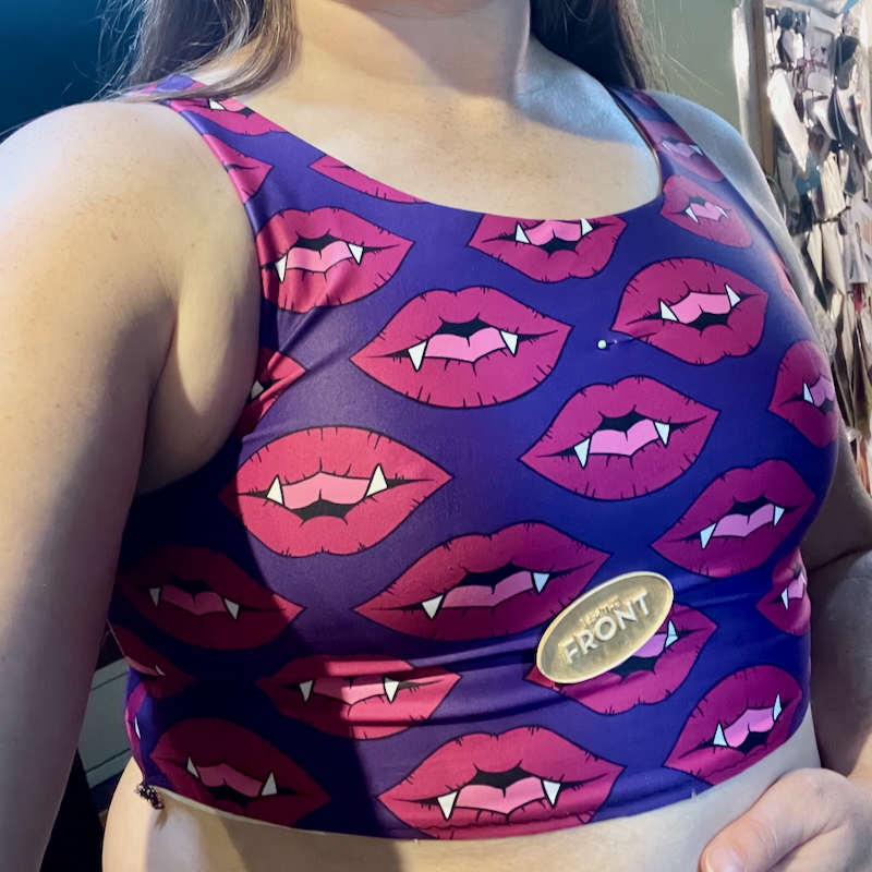 My first instinct was to grab a piece of leftover green banana leaf print lycra, but it turned out there wasn’t quite enough. So my second choice was scraps of vampire lips fabric (Funkifabrics “Bite Me” with ColourMe changes, on Olympus base), leftover from these leggings I made in January 2023. I had to cut the hem band slightly narrower than drafted, and the back band on the lengthwise grain, but otherwise it fit in, and with no scraps leftover! A win!