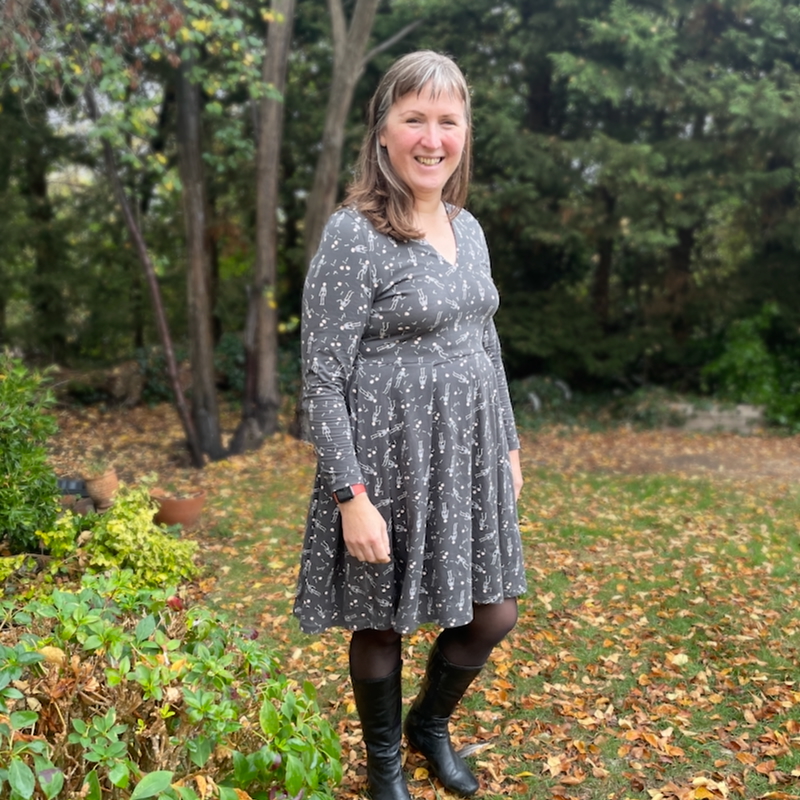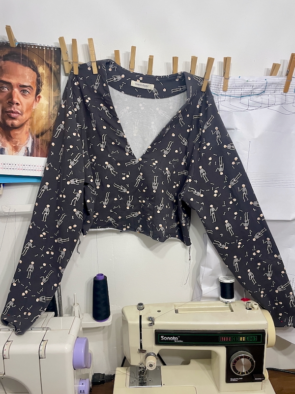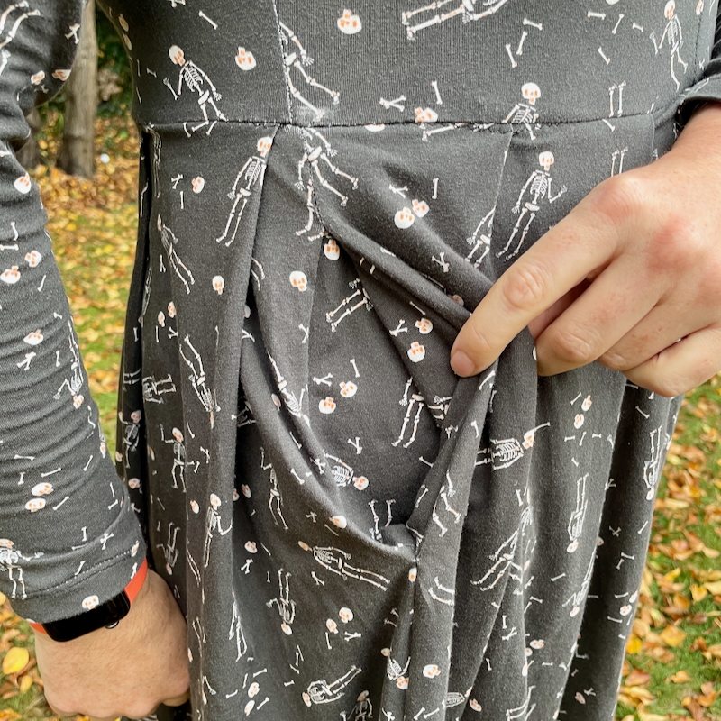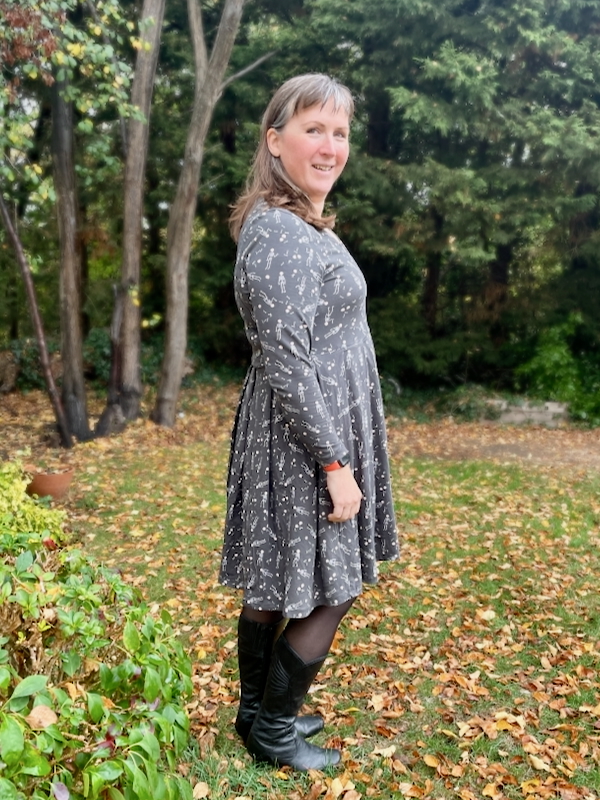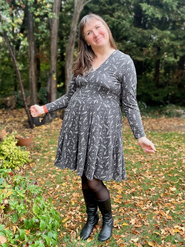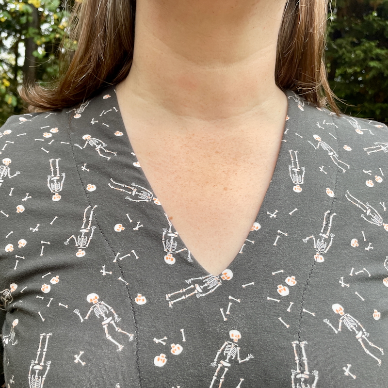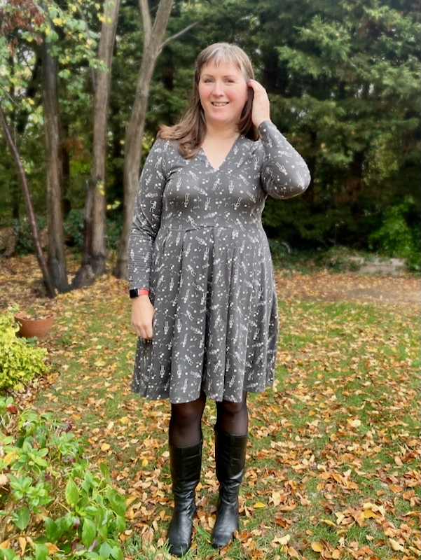 That bat fabric was the Art Gallery Fabrics 2023 Halloween print so there’s no way I could get more, but I was able to get their 2025 Halloween print – the same super soft cotton elastane jersey but with little skeletons all over! It’s called “Mister No Body” and I bought mine from Goldstitch for £35.00 total for the 2.5m (now out of stock, but do some googling as other retailers seem to have it).