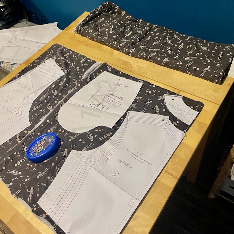 I had to shorten the skirt pieces again to fit it all into 2.5m, but not nearly as much as in the bat dress (which had to fit into 1.9m!). I was also able to squeeze in some in-seam pocket pieces around the bodice and sleeve pieces, so I could add pockets without taking away from the skirt length.
