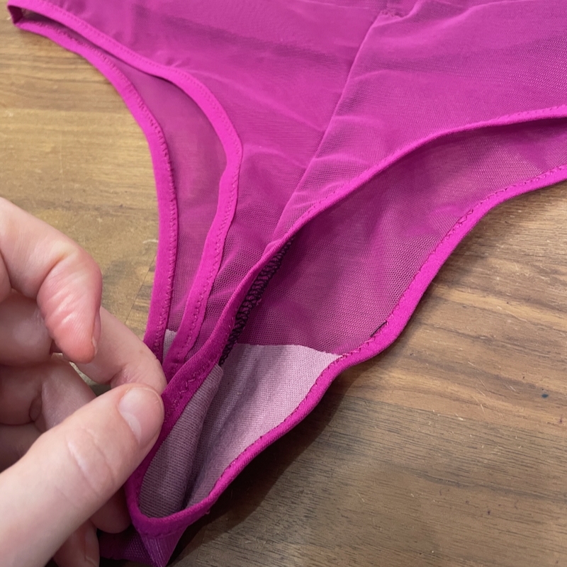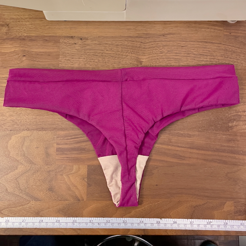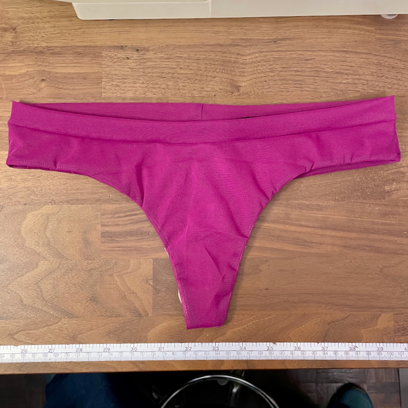 The second, and more important issue, is that this is not a thong. The back crotch area is just as wide as the front – a finished width of 7cm (2 3/4in)?!?! That’s an awkward halfway house between a thong and a brief and will be uncomfortable for 100% of the population. I refuse to believe anyone actually tested this with an all-day wear! 😒 For comparison, the Evie La Luve Chloe Thong is 2cm finished width at the back crotch.