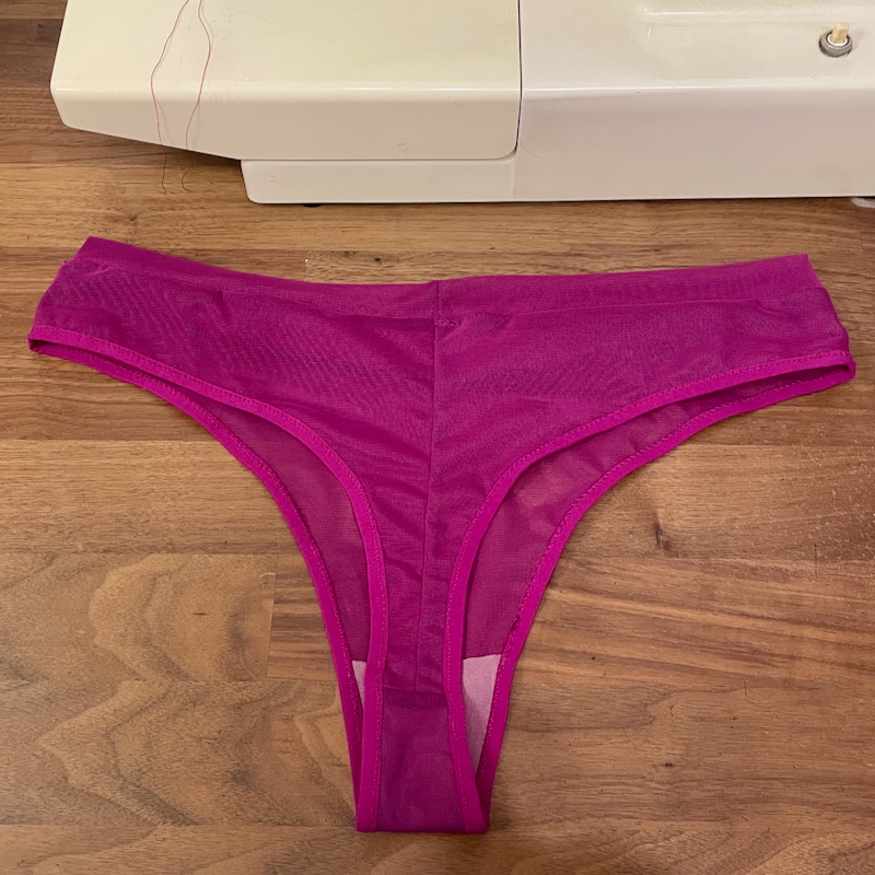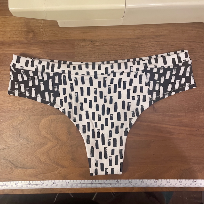 It’s a free pattern designed to use up scrap jerseys, which I have tons of, and that it’s similar to my favourite Lululemon thongs that also use zero elastics. This pattern uses a folded band along the waist edge, and the leg edges are just turned under and hemmed.