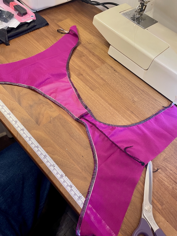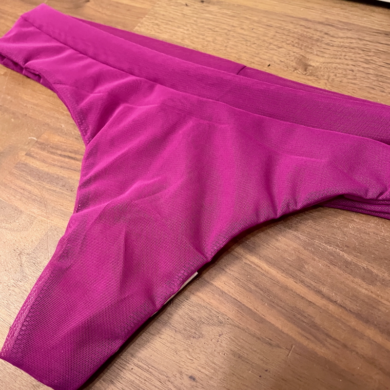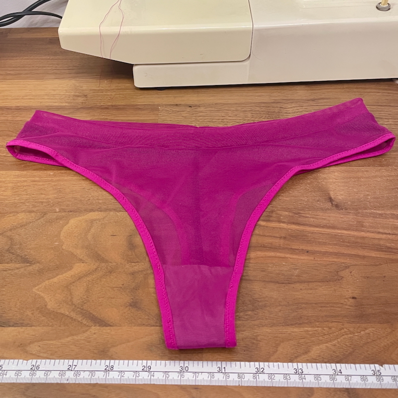 I actually still had some scraps of this mesh leftover from my earlier bra and panty kits, and I could actually squeeze all the pieces except two out of my previous mesh. So I had a LOT of mesh leftover after cutting out the bra – enough for two matching thongs!