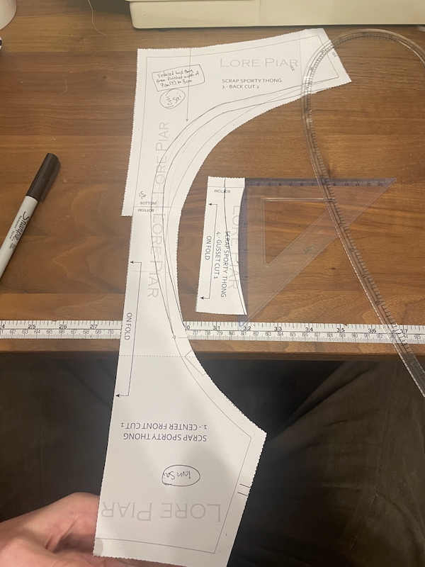 So for my second fuchsia pair, I decided to use the matching FOE for the leg openings (the same as what’s in the kit, but I bought more separately from NCH). So I copied off my altered Scrappy Sporty Thong pieces, removed the seam allowances at the leg openings, and then added 3cm of length into the Front piece (1cm each at 3 different spots), and 2cm into the Back piece in order to account for the lack of vertical stretch in my fabric.