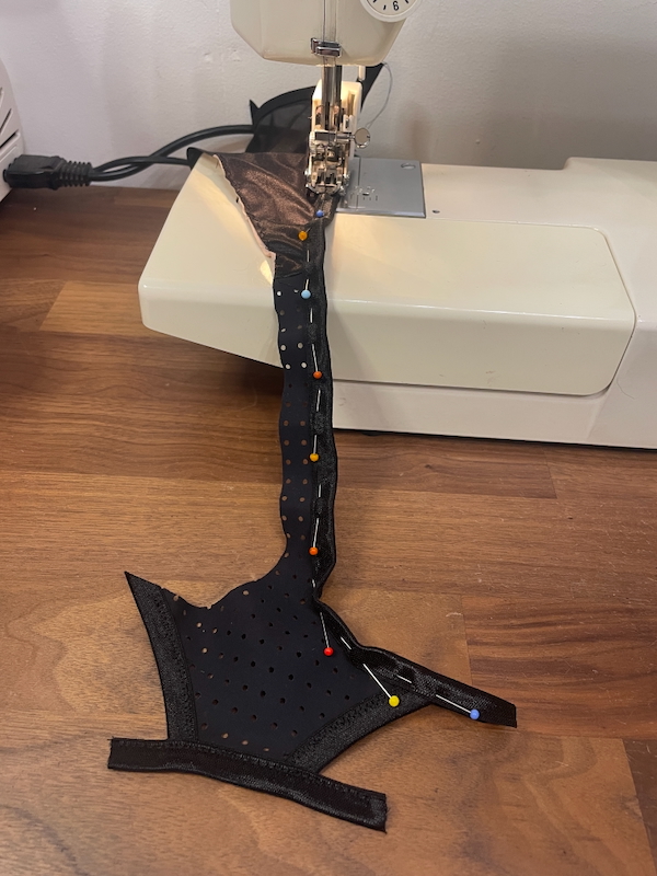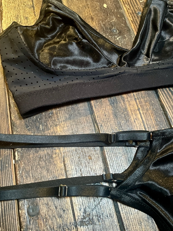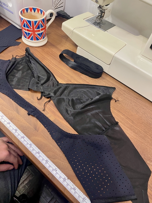 For this set, I already had a semi-sheer satin jersey and small offcuts of the laser cut scuba I used in the black and blue Triumph Suit sample. I also already had black bra straps, a hook closure, and a million rings and sliders. So I only needed to purchase more 1cm (finished width) FOE and plush underbust elastic (which New Craft House had at 17cm width – perfect).