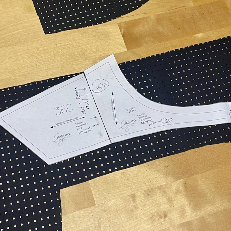 I’ve been wanting to sew the Hari Ito “Epervier Bralette” pattern for a while and even printed it out pre-Long Covid but never quite got around to sewing it. Considering my current lingerie sewing momentum, I thought it’d be a perfect time to give it a try. So I first printed it out in a bigger size – since the NCH Wren bra fits brilliantly at 36 C/D I decided to go with a size 36C for the Epervier too (my pre-LC size was always 34B but I’m still ~10kg heavier). I’m not even going to rehash all the various ways of bra size measuring never ever work for me, so I always just ignore the size charts entirely and choose my RTW bra size which works 90% of the time.